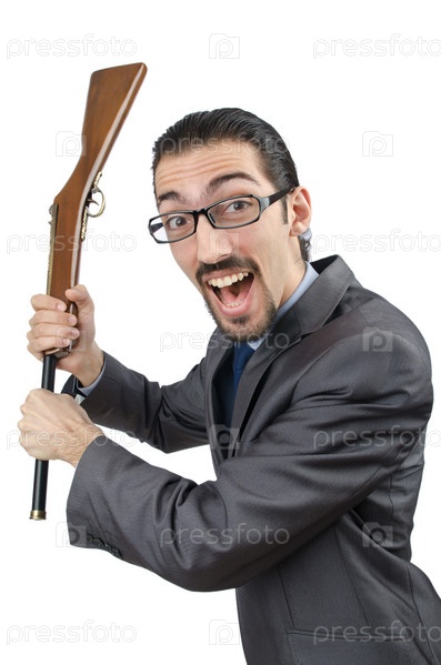 Бизнесмен с оружием, изолированный на белом фоне