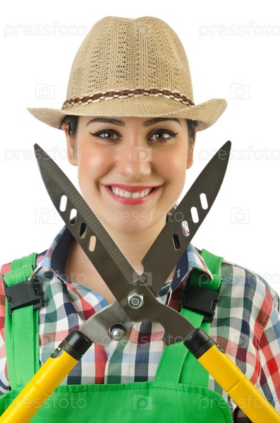 Девушка с садовыми ножницами на белом фоне