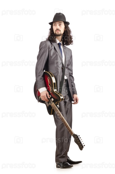 Гитарист в деловом костюме на белом фоне