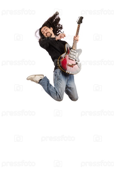 Молодой мужчина играет на гитаре на белом фоне