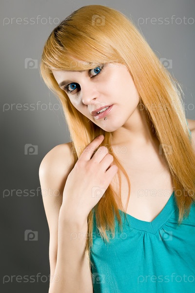 Молодая голубоглазая блондинка на сером фоне