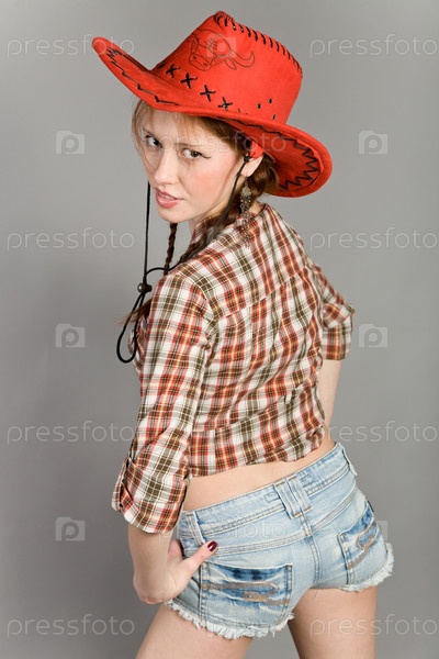 Молодая девушка в клетчатой рубашке и красной ковбойской шляпе