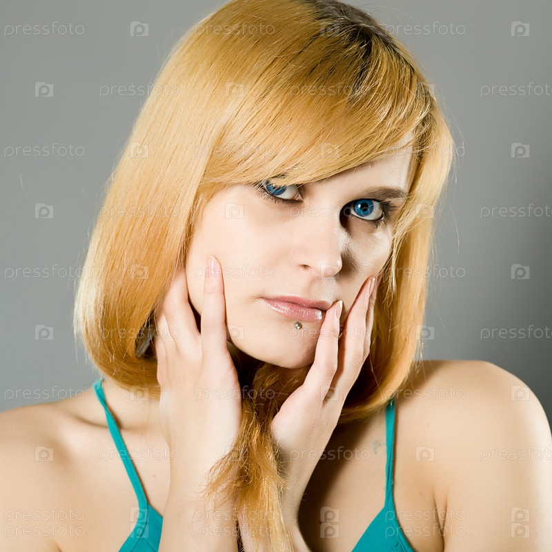 Голубоглазая блондинка на сером фоне