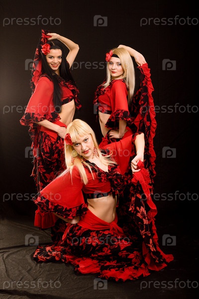 Три красивых девушки в цыганских костюмах на черном фоне