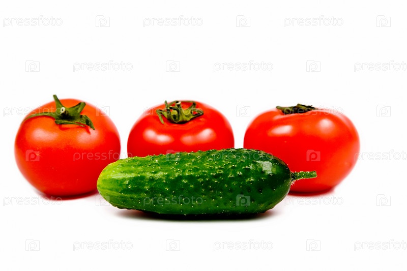 Три красных помидора и огурец на белом фоне