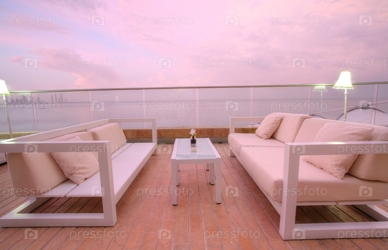 Кресла и диван на открытой терассе на закате