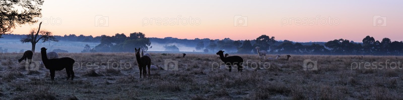 Альпаки рано утром на поле на полуострове Морнингтон, Виктория, Австралия