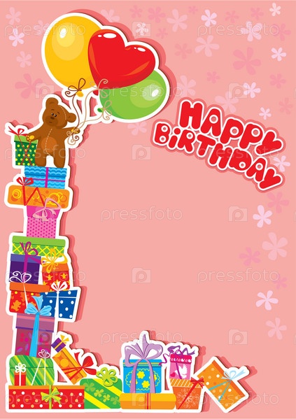 Открытка "День рождения" с подарочными коробками, воздушными шарами и плюшевым медведем