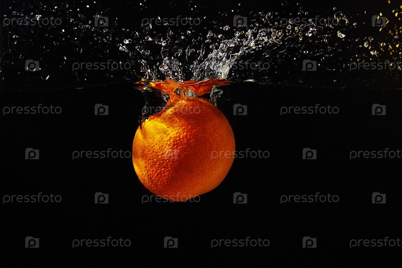 Спелый апельсин плещется в воде крупным планом на черном фоне