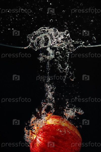 Красное яблоко падает в воду со всплеском на черном фоне крупным планом
