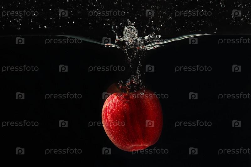 Красное яблоко падает в воду со всплеском на черном фоне крупным планом