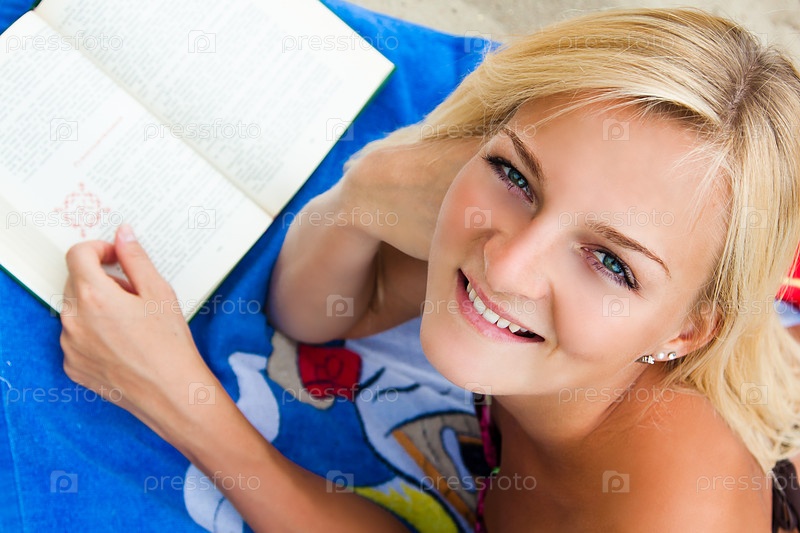 Молодая красивая женщина отдыхает на пляже и читает книгу в твердой зеленой обложке