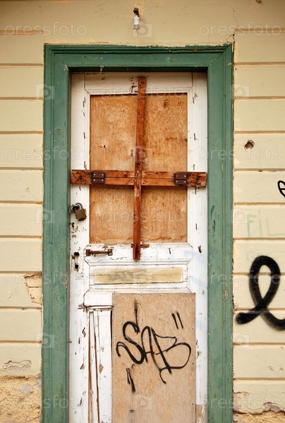 Заколоченная дверь и обшарпанная стена заброшенного дома