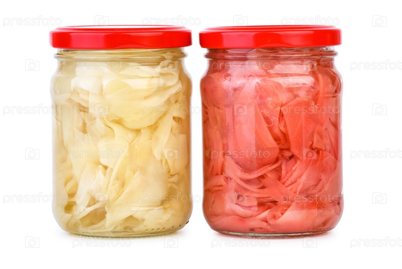 Стеклянные банки с консервированными ломтиками имбиря на белом фоне