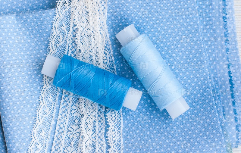 Катушки ниток, кружева и ткани