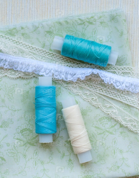 Катушки ниток, кружева и ткани