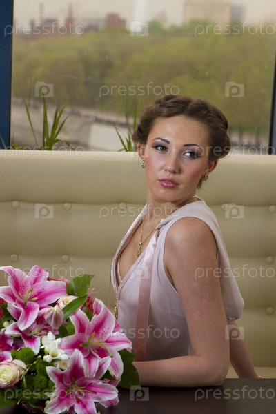 Сексуальная девушка в розовом с букетом цветов