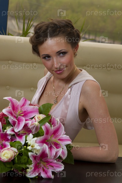 Сексуальная девушка в розовом с букетом цветов