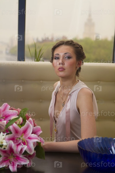 Сексуальная девушка в розовом с букетом цветов