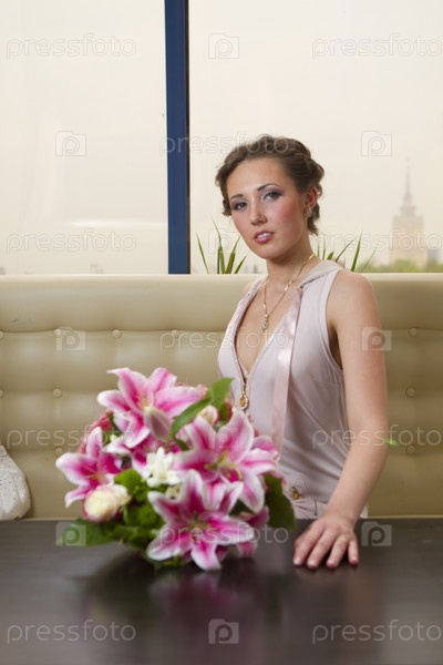Сексуальная девушка в розовом с букетом цветов