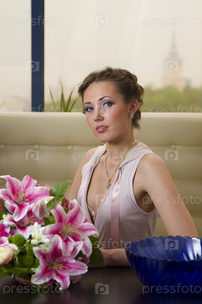 Сексуальная девушка в розовом с букетом цветов