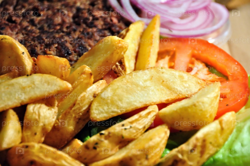 Бургер с картошкой фри, помидоры и лук