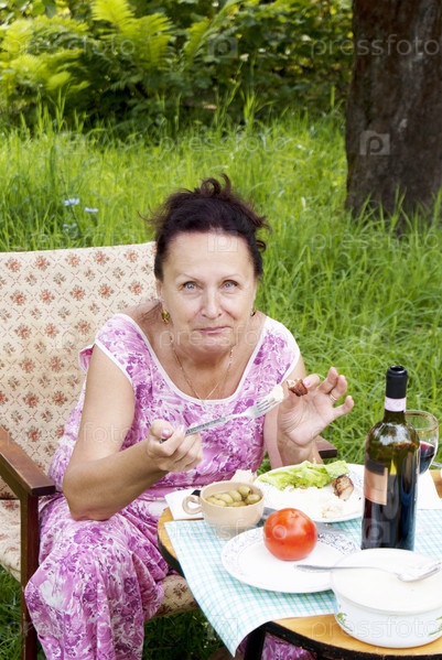 Женщина с аппетитом кушает в летнем зеленом саду