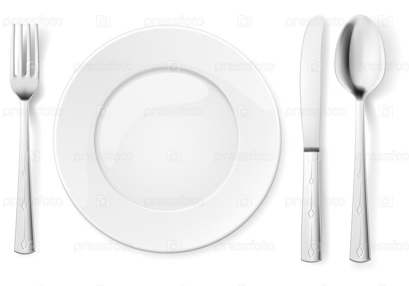Пустая тарелка с ложкой, ножом и вилкой. Иллюстрация для дизайна на белом фоне