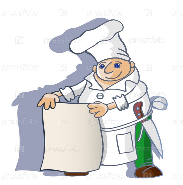 Веселый повар держат салфетку, на которой можно написать меню. Контур и цвет в различных группах, есть градиенты