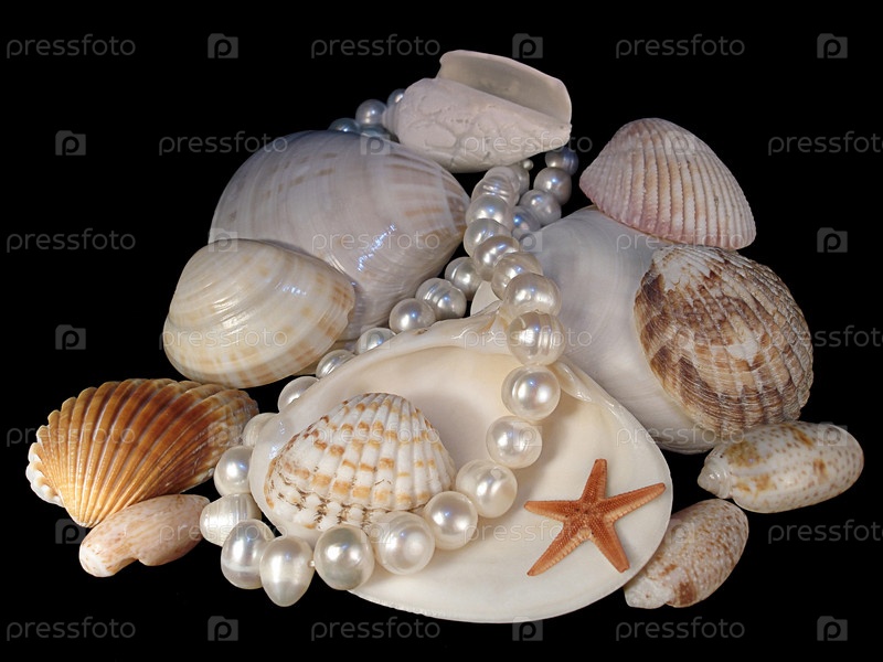 Группа различных раковин моллюсков и жемчужное ожерелье