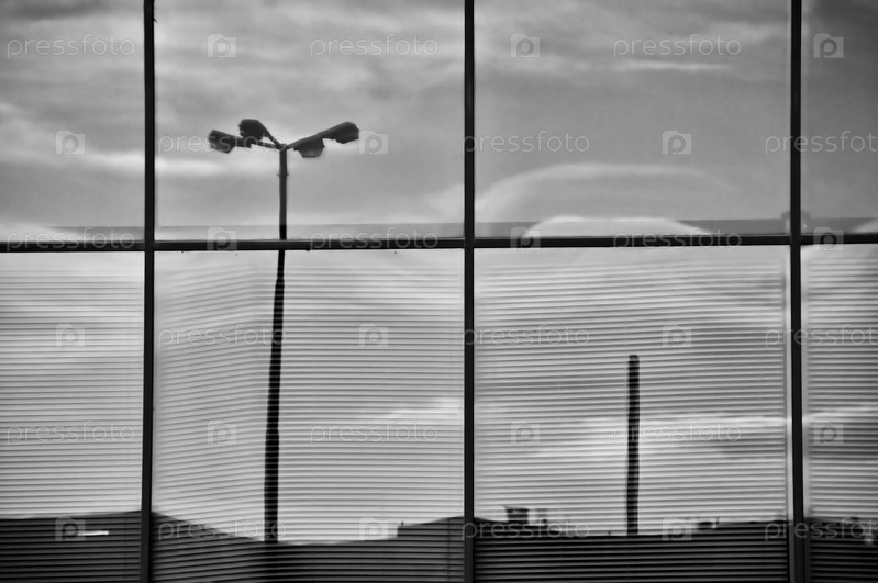Пасмурное небо и уличные фонари отражаются в окнах современного офисного здания. Архитектурная деталь