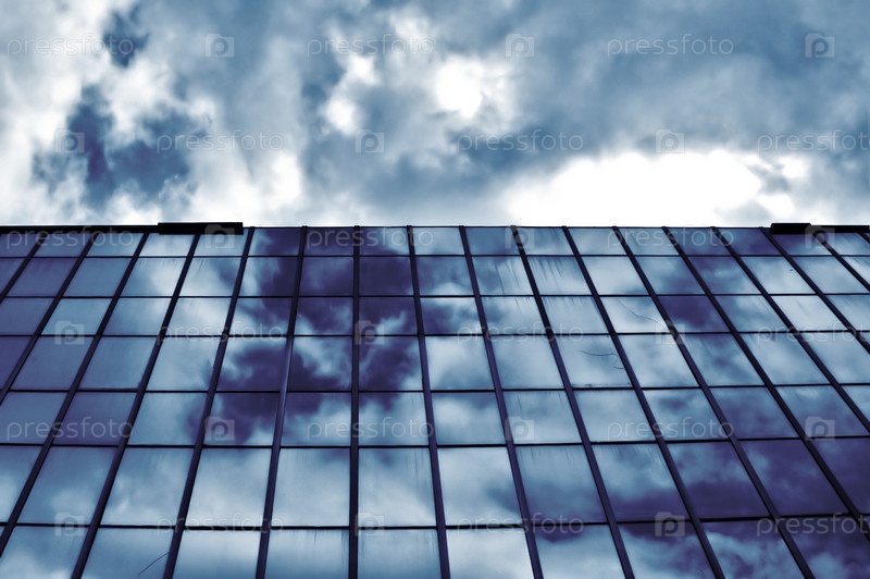 Пасмурное небо отражается в стеклах современного здания. Архитектурная деталь