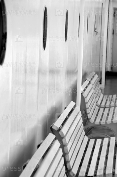 Ряд скамеек на палубе корабля. Черное и белое