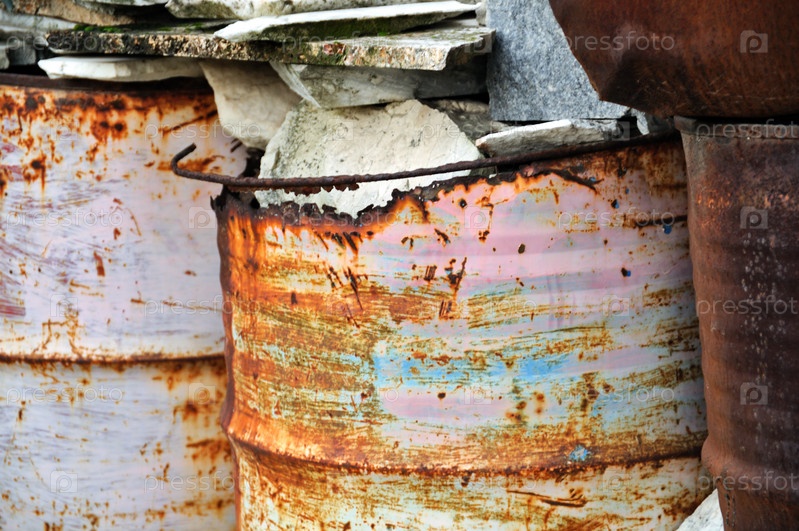 Ржавые металлические бочки заполнены камнями. Абстрактный фон