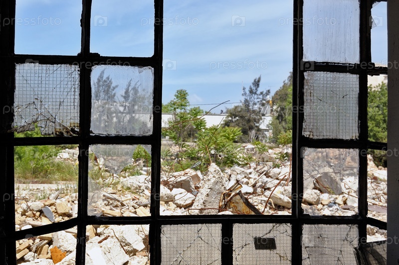 Груда камней из сломанного окна частично разрушенной фабрики