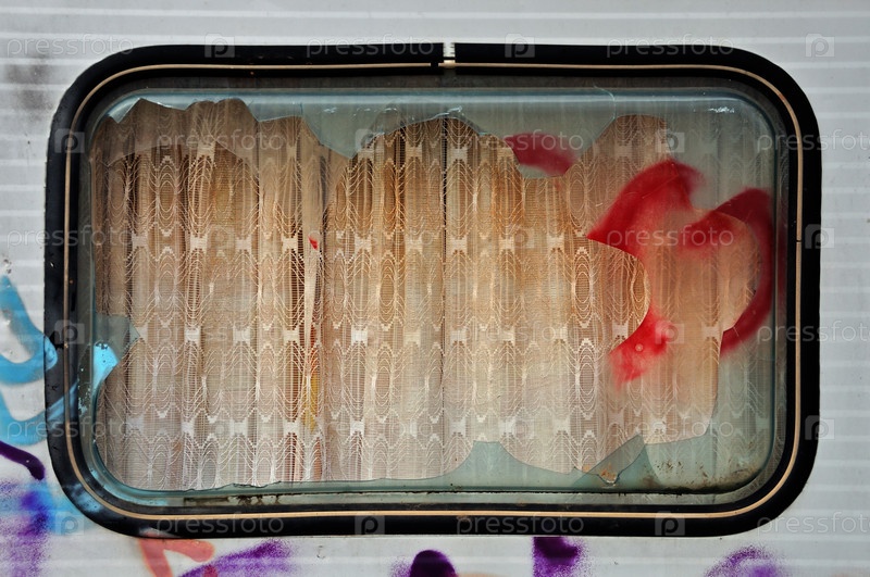 Разбитое окно и занавес заброшенного трейлера