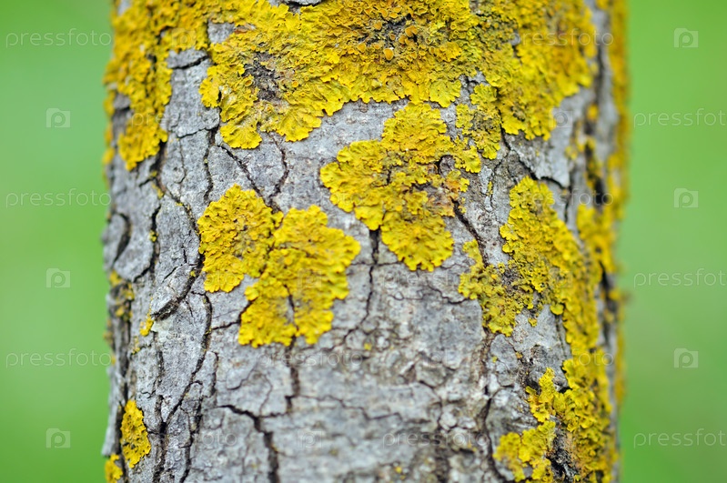 ствол дерева с желтым лишайником крупным планом. Выборочный фокус