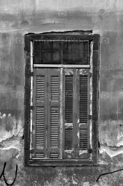 Старинные ставни и шероховатая стена заброшенного дома. Черное и белое