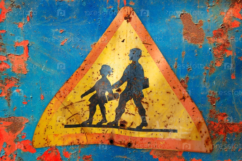 Ржавый дорожный знак, предупреждающий о детях школьного возраста. Ограничение скорости