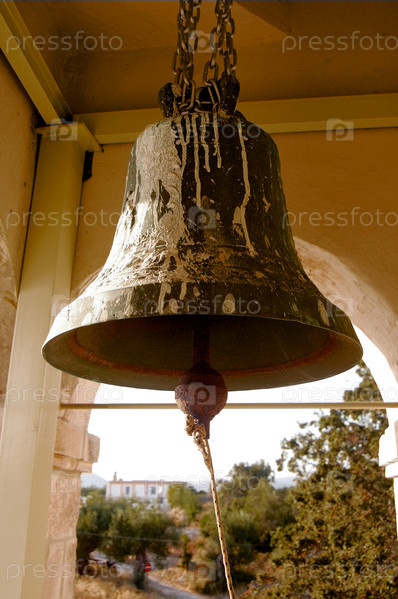 Ржавый колокол внутри старой церковной колокольни в деревне в Греции