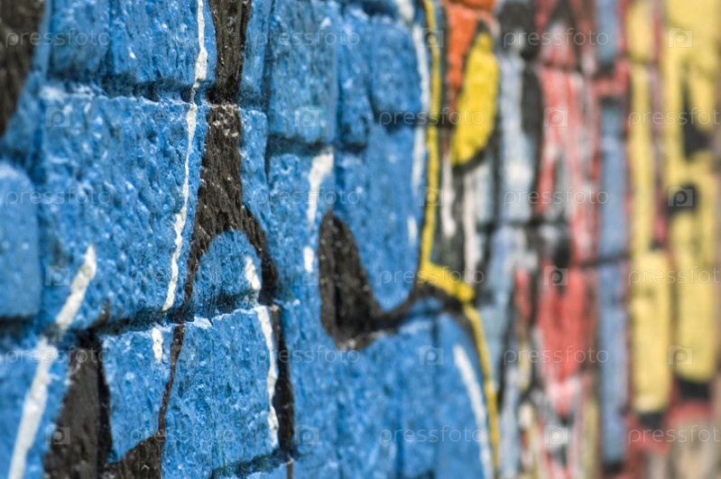 Поверхность каменной стены, покрытой яркими граффити. Городское уличное искусство