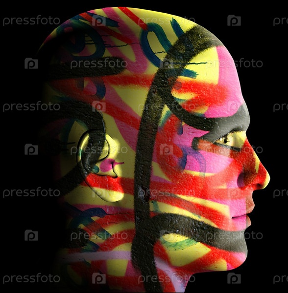 Мужской портрет, покрытый беспорядочными граффити. Трехмерная цифровая иллюстрация