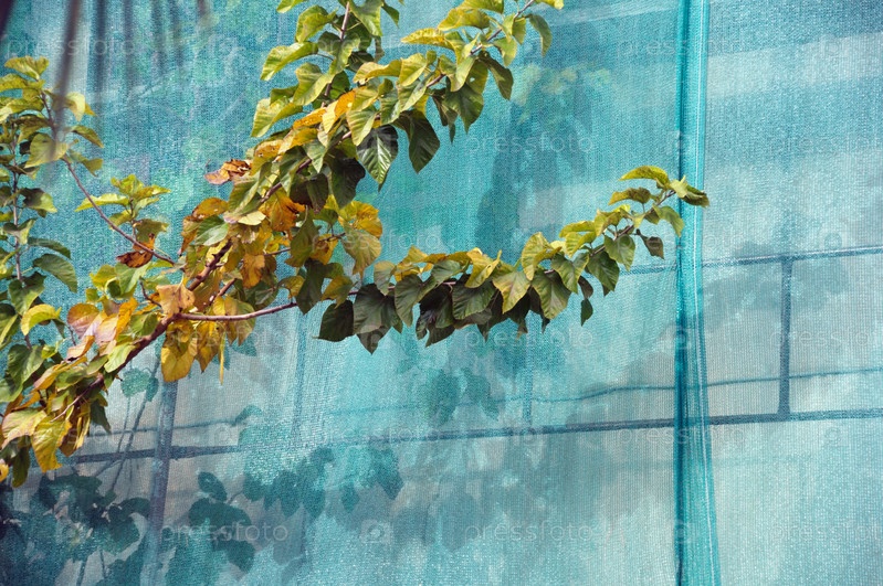 Зеленая строительная сетка и ветки дерева на строительной площадке