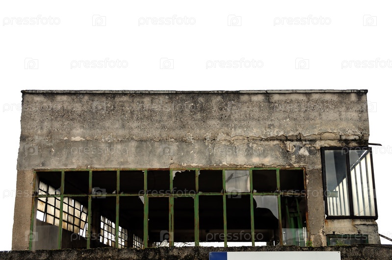 Разбитые окна на фасаде заброшенного склада