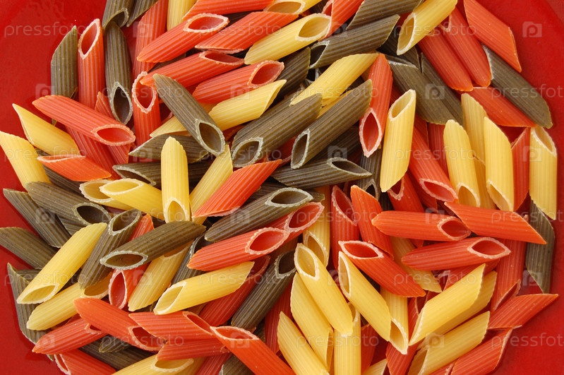 Трехцветные макароны на красном фоне. Итальянская кухня