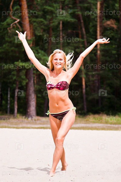 Молодая и красивая женщина гуляет по песчаному пляжу