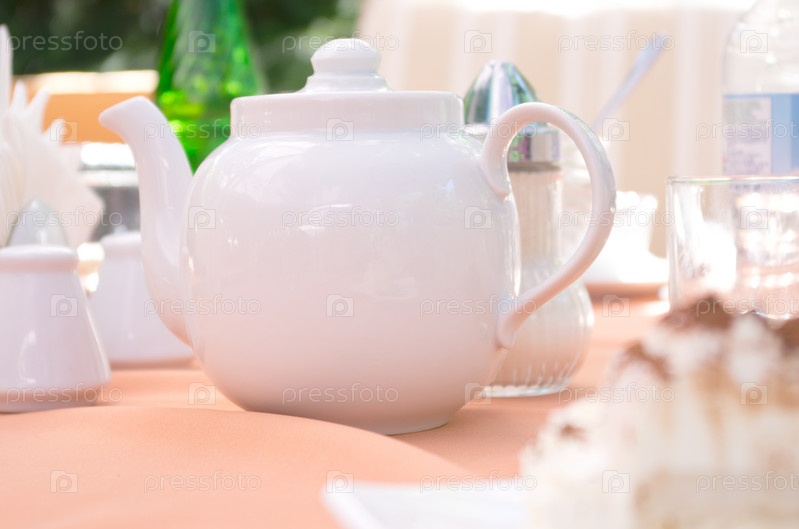 Заварочный чайник, окруженный посудой, на столе