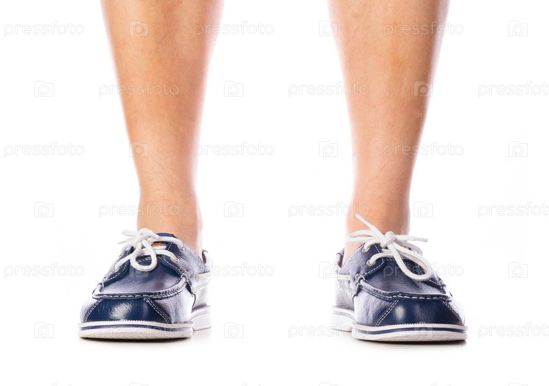 Синие кожаные туфли на толстой подошве на голых ногах, изолированные на белом фоне