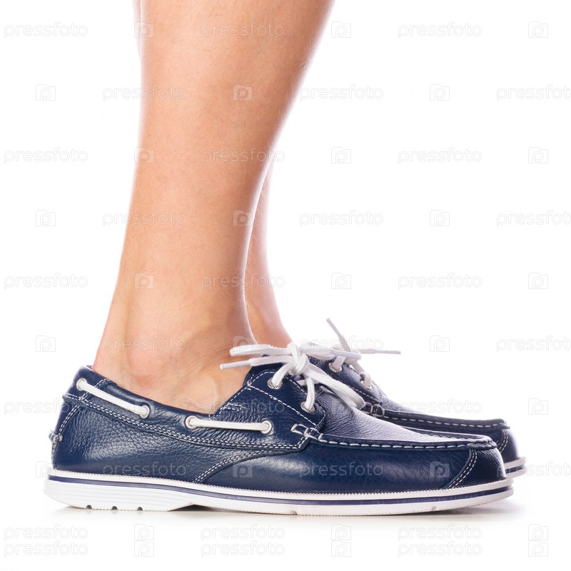 Синие кожаные туфли на толстой подошве на голых ногах, изолированные на белом фоне