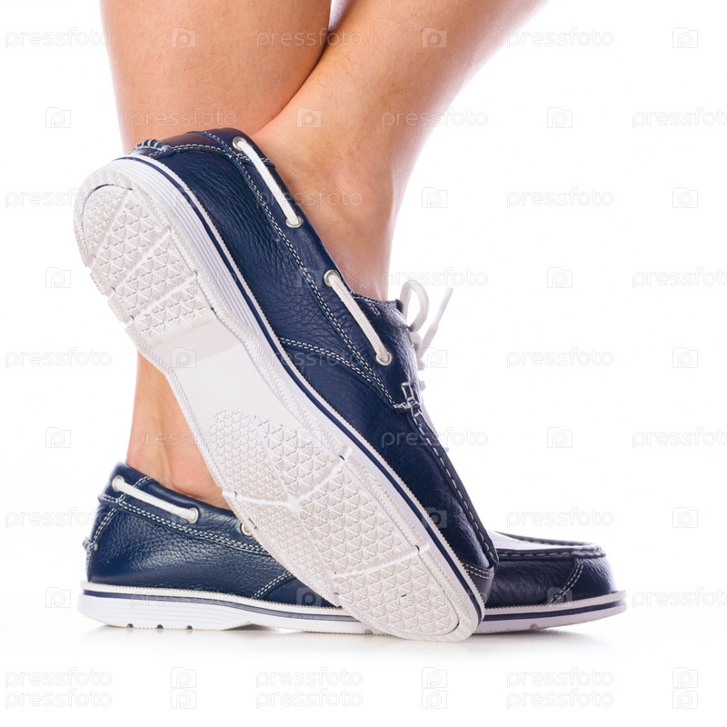 Синие кожаные туфли на толстой подошве на голых ногах, изолированные на белом фоне